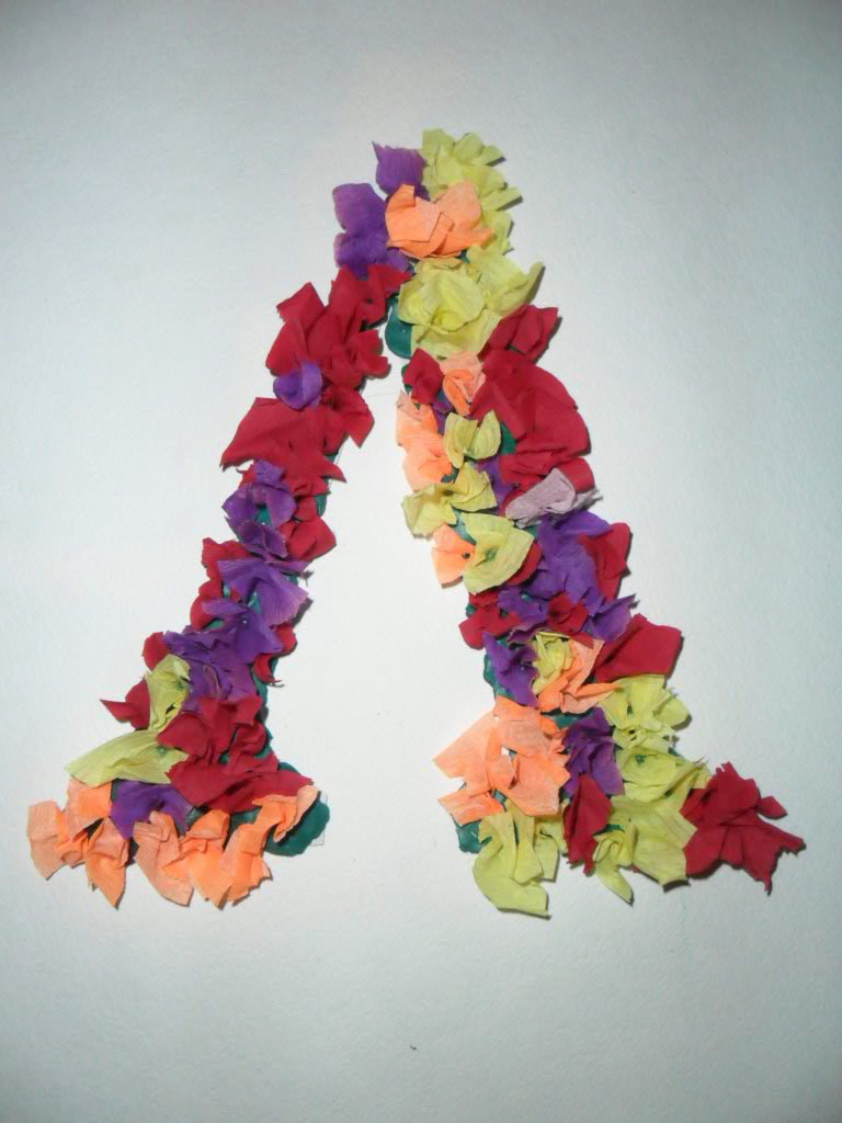 Эта буква сделана из шариков, выполненных из разноцветных салфеток. Отрываете небольшой кусочек салфетки и пальцами скатываете шарик. Сначала лучше накатать много шариков, а потом приклеивать их по контуру буквы, нарисованной детьми.