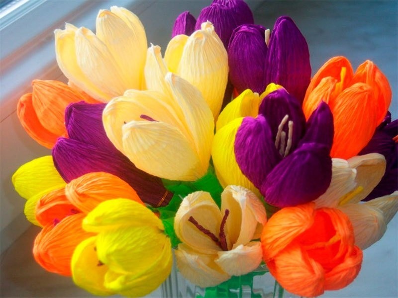 Обязательно попробуйте мастер-класс по изготовлению из гофробумаги тюльпанов, которые завораживают своим изяществом.