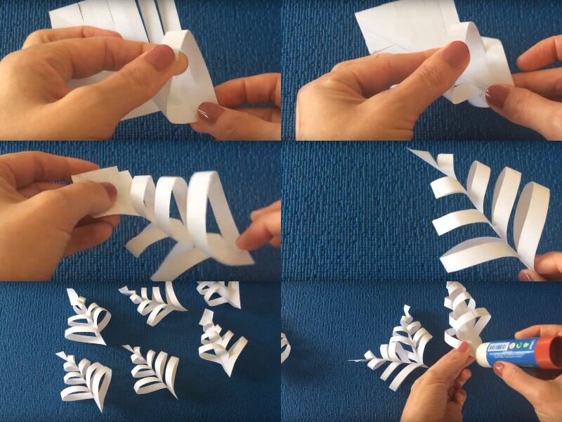 Снежинку будем делать согласно схеме. Бумажный листочек сворачиваем по диагонали, делаем три прорези со стороны сгиба. Соединяем два самых коротких кончика. Разворачиваем заготовку изнаночной стороной. Склеиваем кончики двух средних полос. Заготовку снова разворачиваем и продолжаем, пока все концы не склеятся. Получится 6 заготовок.