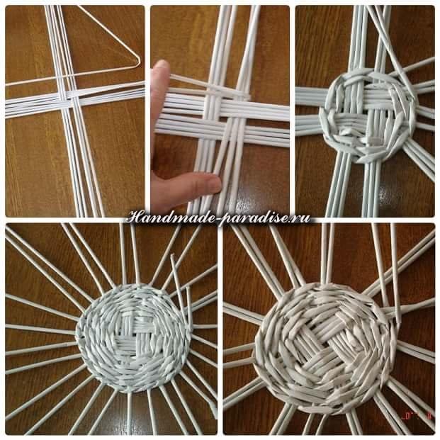 В том месте, где заканчивается трубка, крепим ее к ней следующую, вставляя одну в другую. Трубки между собой можно соединить клеем. В итоге, сплели дно.