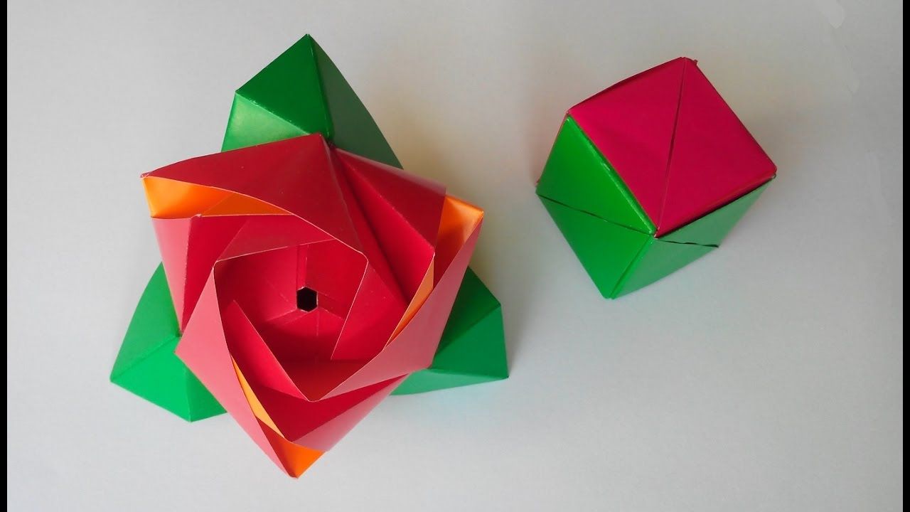 Поделка превращается из розочки в куб и наоборот. Для этого нужно приглаживать лепестки или высвобождать их. Бумагу для такого трансформера лучше брать плотную и гладкую.