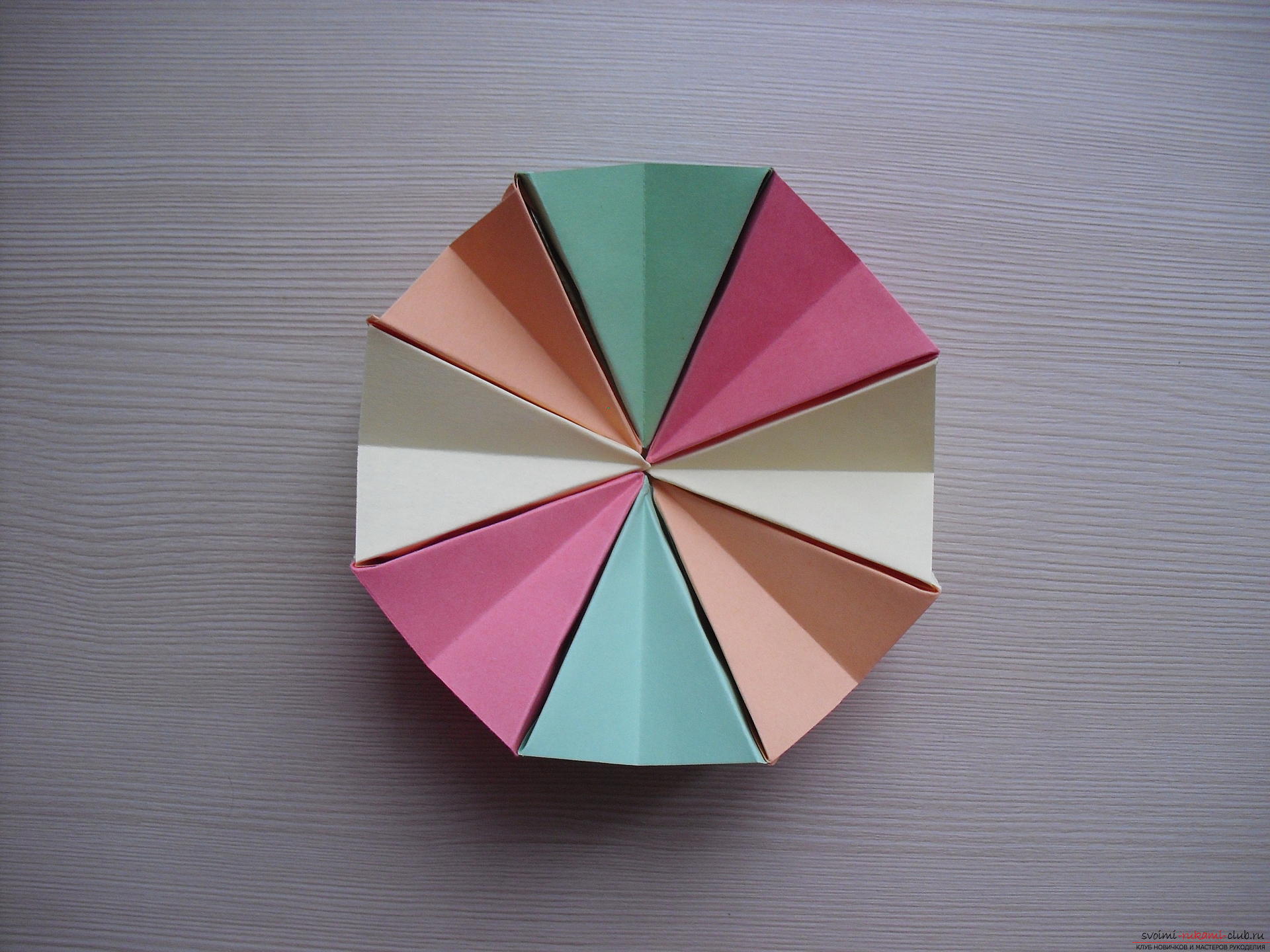 Подготовьте 8 цветной бумаги 10х10 см. Из каждой нужно сложить модуль, следуя пошаговой инструкции: