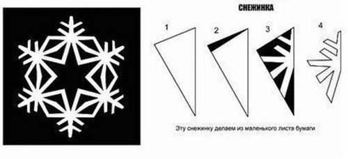 В приведенных выше примерах нужно вырезать снежинку по приведенной сверху схеме таким образом, чтобы осталась только белая часть, черная должна быть отрезана.
