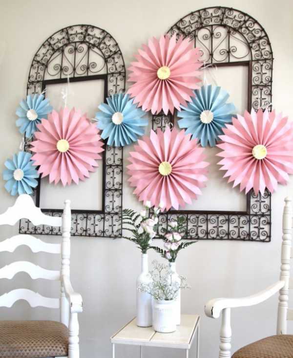 Бюджетный способ – можно украсить стену в комнате своими руками из бумаги, сегодня это в тренде. Роскошно смотрятся одинаковые элементы на акцентной поверхности и объемные цветы крупного формата общего цвета с обоями.