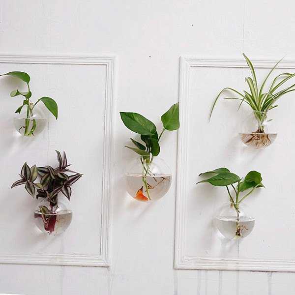 Озелените свой дом, не заставляя при этом столы и подоконники. Маленькие легкие горшочки или вазочки, выполненные в одном стиле и прикрепленные на стену в виде экспозиции, помогут вам это сделать. Горшки можно купить в магазине, или сделать самому из дерева или банок.