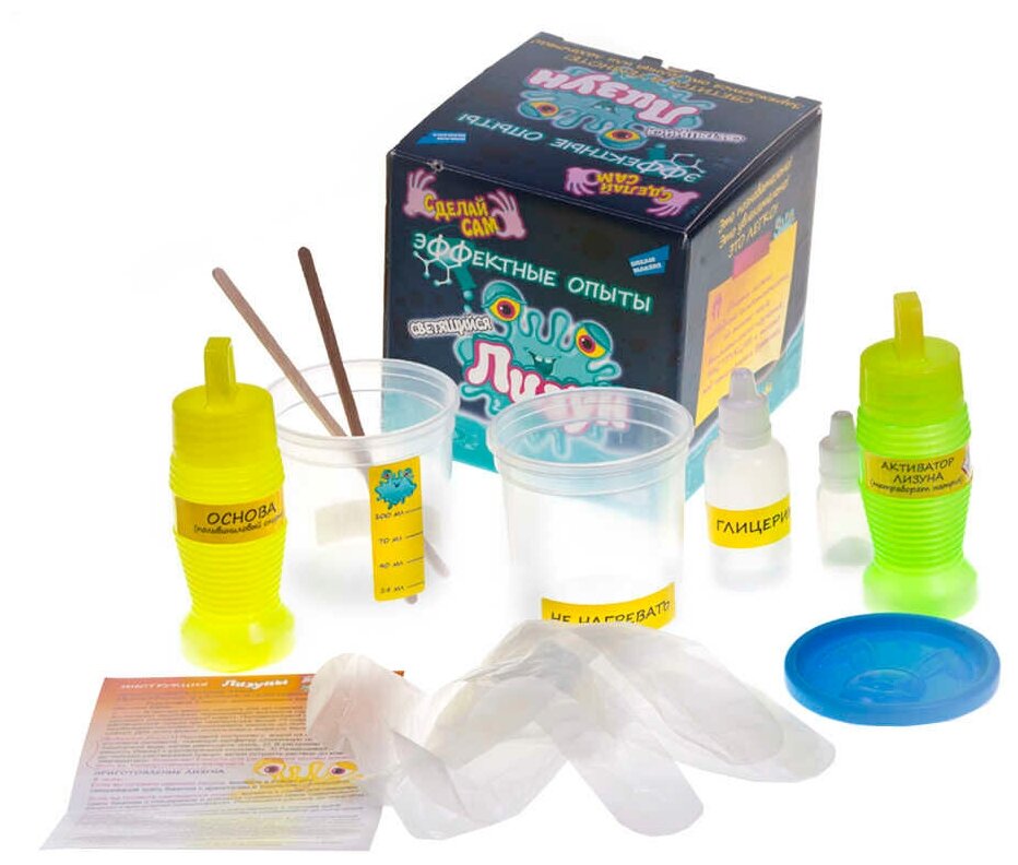 | Состав набора | раствор для замешивания (бура, фосфорный порошок), клей (6 шт), блестки (3 шт), емкость для смешивания (2 шт), ложка/палочка (2 ложки, 6 палочек), инструкция, шарики/посыпка (бисер) |