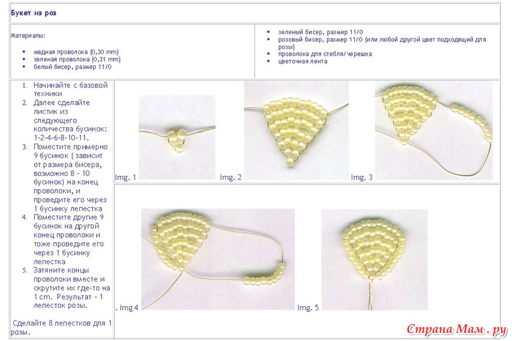 Как уже упоминалось раньше, для того чтобы сплести из бисера цветы, их лепестки и листья, вам понадобится знать именно французский способ рукоделия. А для этого пригодиться схема, на которой все подробно изображено.