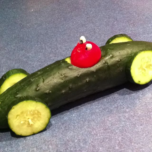Прикрепите колеса зубочистками. Отрежьте две детали от огурца: с одной стороны косой срез, а с другой – ровный. Из этого у нас получиться тело героя.