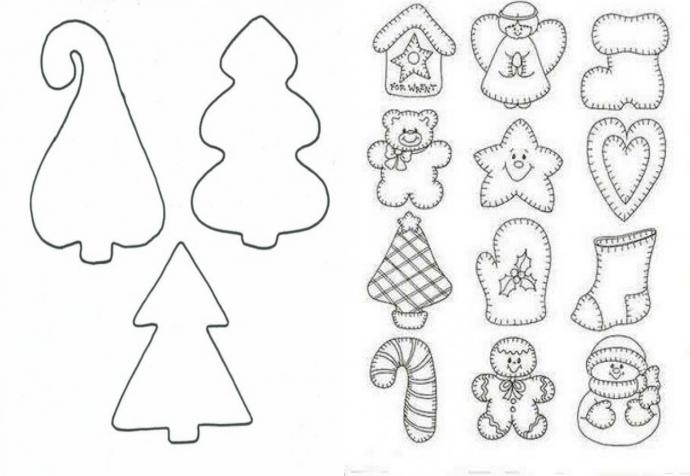 Чтобы сделать такие симпатичные новогодние игрушки вам потребуется заготовить выкройки из бумаги или картона, по ним обрисовать детали, вырезать и аккуратно сшить их, как на фото.
