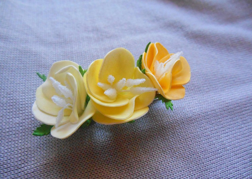 Заколка готова и может украшать новые прически. Любому мастеру будет приятно похвастаться такими поделками из фоамирана для начинающих, что, несомненно, вдохновит его на более интересное творчество.
