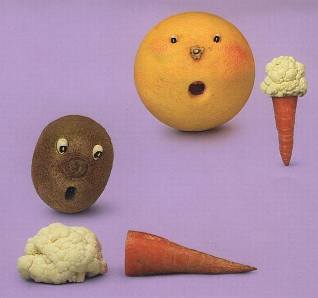 Овощи и фрукты стоят совсем недорого и всегда есть в наличии у вас дома. Кроме того, эти предметы очень легко режутся или ножницами или острым ножом. Эти свойства позволяют детям очень просто создавать композиции из этих предметов.
