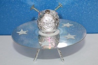 Детки могут смастерить из ненужного лазерного диска летающую тарелку. Кроме того, нам понадобятся фольга, пластилин, звездочки, кусок проволоки, прозрачный колпачок от дезодоранта или другой косметики (2 шт.), украшения и какая-то игрушка, которая будет изображать инопланетянина.