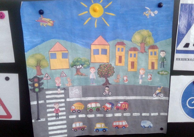 Воспитатель: Вспомните, ребята, что просил нас Иван Петрович ещё сделать на проезжей части? Пока вы клеили машины, я сделал светофор и пешеходный переход. Сейчас я их наклею на нашу улицу. Уважаемый Иван Петрович, вам нравится наша улица?