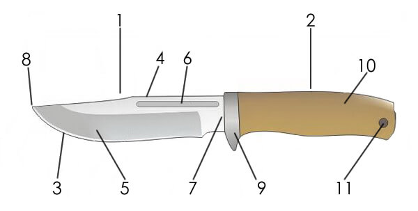 Такое холодное оружие имеет хвостовик для рукояти из единой металлической заготовки. Острую кромку ребра клинка называют лезвием. Это и есть режущая часть ножа. Противоположную кромку всегда делают тупой, ее часто называют обухом.