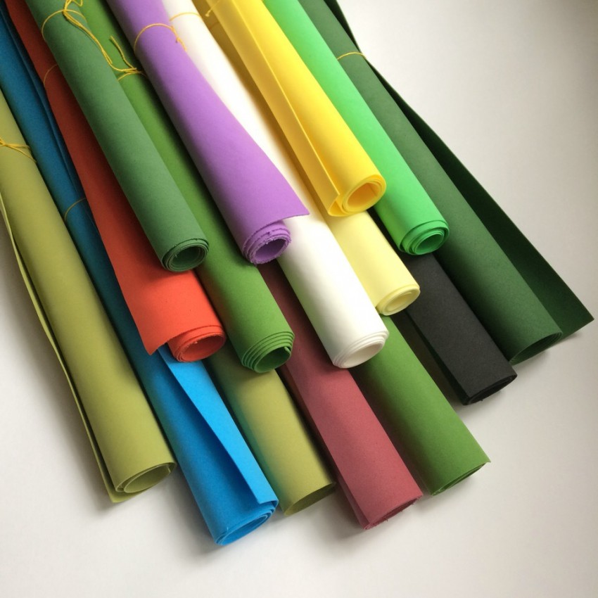 Применяется пластичная бумага китайского производства. Она пахнет резиной, бывает различной толщины, из-за твёрдости не подходит для изготовления цветов, хороша для скрапбукинга. Есть также зефирная разновидность, которая имеет видовые различия: