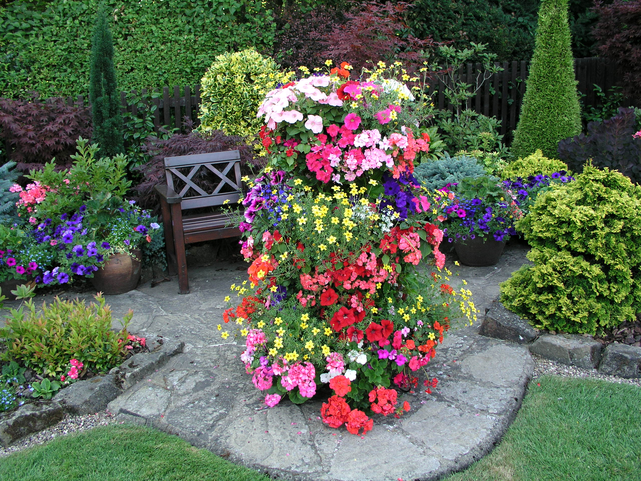 Оригинальная композиция клумбы, сочетающая и ампельный уровень, и все ярусы от низкорослых, до высоких растений.