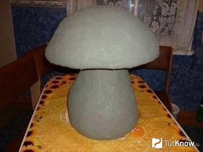 Облик гриба сформирован, но он ещё груб, поэтому занимаемся отделкой. Если грибок планируется использовать в помещении, то его подравнивают штукатуркой для внутренних работ, если место самоделке на улице, то применяют фасадный состав. Перед штукатуркой гриб промазывают обойным клеем, он выступает в роли грунтовки и гарантирует сцепку штукатурки и полиуретана.