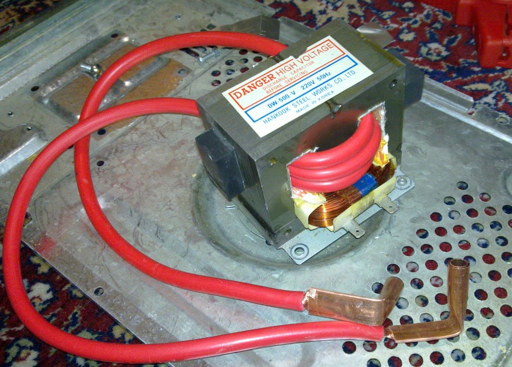Микроволновка работает под высоким напряжением, поэтому первичная обмотка трансформатора имеет меньшее количество петель, чем вторичная.