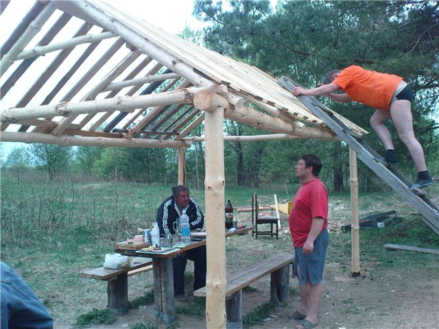 Четвертый этап. Строительство. Все строительство, котрое будем делать своими руками, мы разбили на два этапа. Сначала заготавливаем лес – рубим нужные деревья, отпиливаем по длине (а длину мы знаем – мы ведь заранее все планировали – какой длины и сколько нужно столбов), и снимаем кору, чтобы просушить столбики. С березы трудно снять кору, поэтому нужно с четырех сторон просочить ствол (сделать топором продольные срезы коры – чем больше, тем лучше, чтобы ствол просыхал). Все заготовленные столбы прислоняем вертикально к чему-нибудь для дальнейшей просушки. Если не снять кору – то дерево не будет сохнуть и его повредят жуки, дерево сгниет, а жуков начнут выдалбливать дятлы и окончательно разнесут навес в щепки и крыша упадет (мы такое чудо видели). Да и сырое дерево очень тяжелое для работ с ним.
