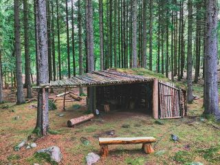 Для начала подготовьте пару крепких рогулин – они станут основой шалаша. Вбейте их в почву приблизительно на треть, они должны держаться при любых обстоятельствах. Сверху горизонтально положите такую же прочную палку, а уже на неё – в ряд и под наклоном – более тонкие жёрдочки; они станут стропилами. Уже на стропила следует класть лапник и ветви с листьями. Этот верхний слой должен полностью перекрывать нижний – кроме того, каждая следующая ветка верхнего слоя до половины прикрывает предыдущую. Таким же образом покрывают заднюю стенку двускатного шалаша. Щели в крыше двускатного шалаша заткните мхом и пучками сухой травы. Зимой всё это сооружение можно утеплить снежными пластами, уложенными поверх него – однако мы рекомендуем в холодное время года сразу Строить иглу (снежный дом).