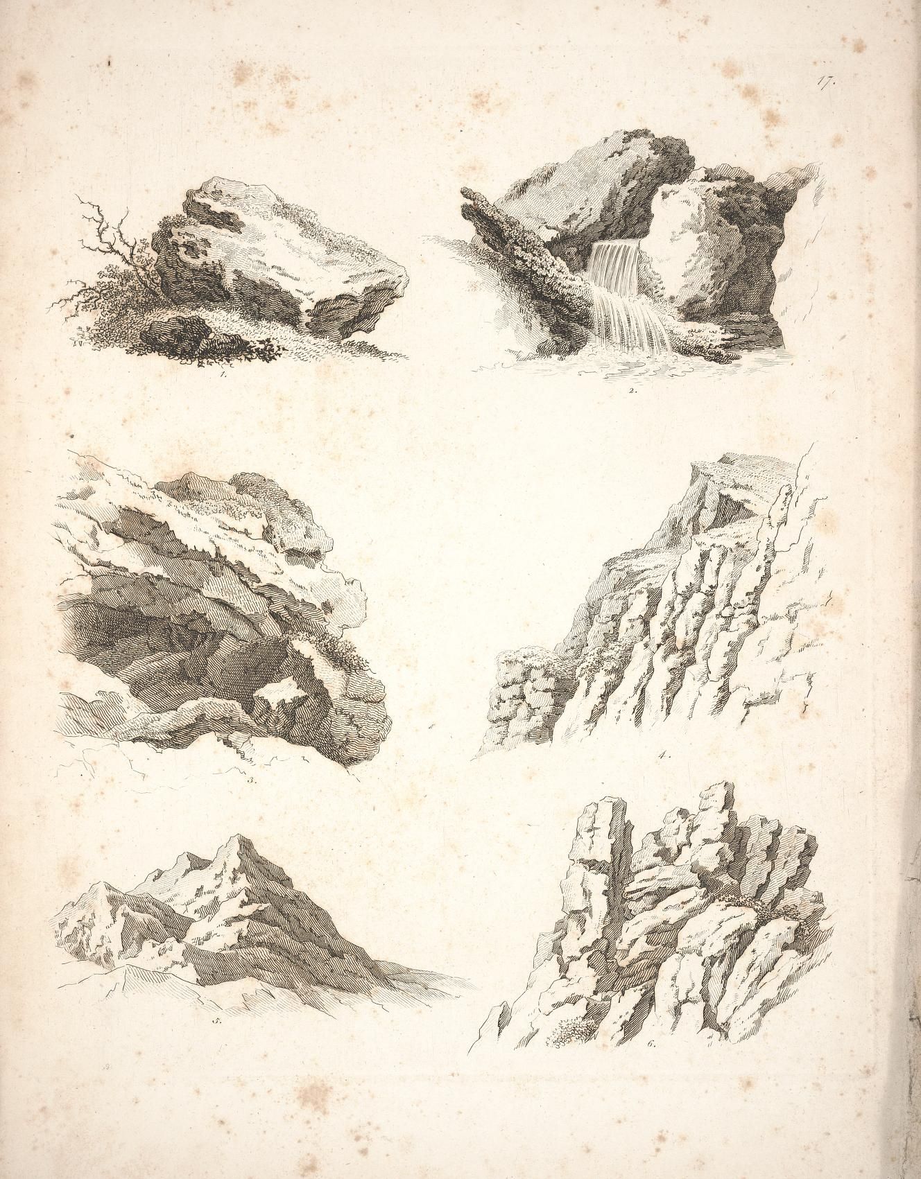 Свет и тень играют важную роль в изображении реалистичных скал. На этом эскизе изображены камни, где показаны их углы и плоскости с учетом света в верхнем правом углу.