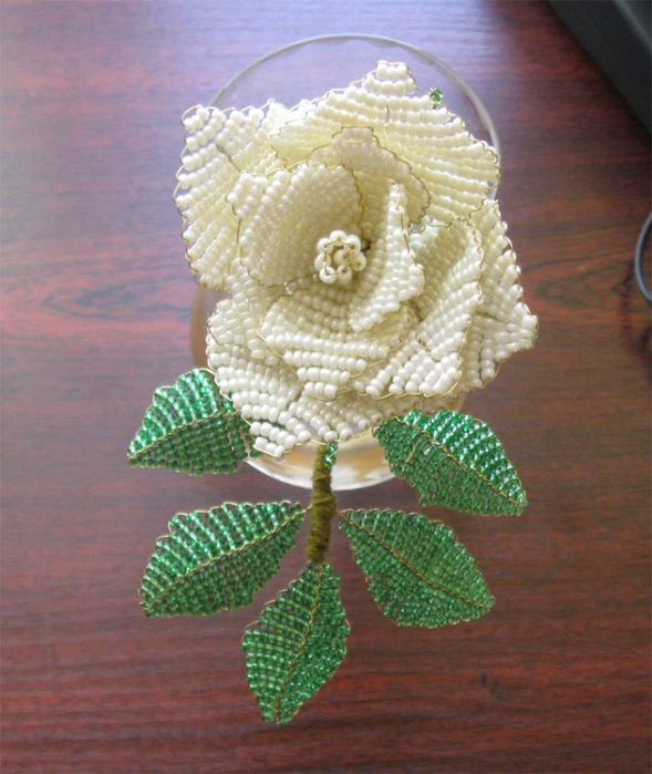 Если вы захотите, то добавьте большее количество лепесточков. Белая роза из бисера готова.