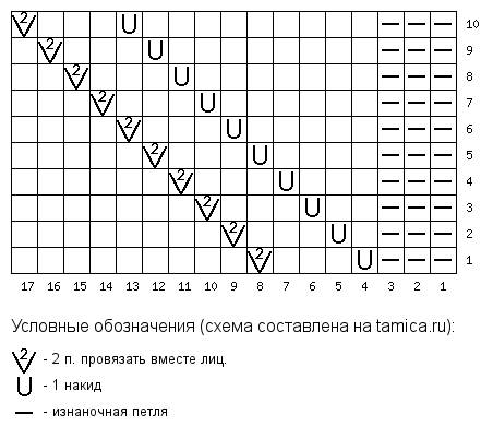 ряд 8 : *1лиц, 2изн* повторять от * пока не останется 2 петли, затем 1 лиц, затем последнюю петлю этого ряда вместе с первой петлей следующего ряда (20 петель)