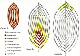 в белом, желтом и розовом цветах. В качестве декора полезны коричневые тона и листья папоротника. На тычинках цветка собираются желтые и коричневые. Веточки оформляем бусинками белого цвета, как по схеме №2. По рисунку №1 выполняют лепестки. Два из них превращаем солому в бутон. Далее делаем несколько зеленых листочков (последовательность их плетения, подскажите схема №3).