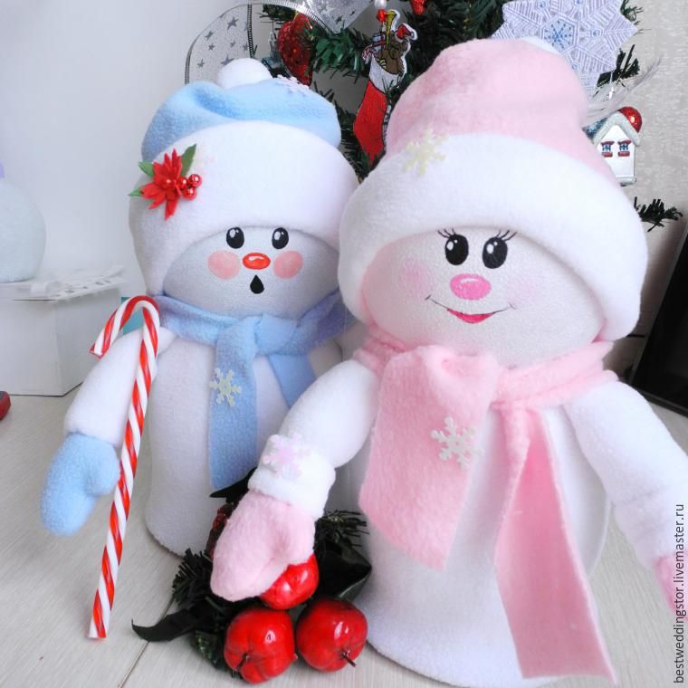 Снеговиков можно сделать несколько, чтобы они составили компанию. Стоит только одеть их в разные аксессуары, и получатся неповторимые фигурки.