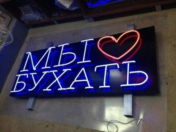 Вывеска из открытых неоновых трубок притягивает взгляд, неоновое свечение очень равномерное, яркое и запоминающееся.