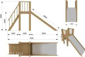 Высота этого сооружения — 3 метра, длина ската — 6 метров. Площадка расположена на расстоянии 2 метров от земли. От этих цифр зависит длина поручней, которые приделывают к конструкции по бокам спуска.