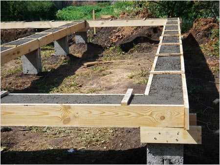 Могут забиваться бетонные сваи заводского производства (потребуется привлечение тяжелой специальной техники) или буронабивные сваи. В случае с буронабивными сваями также производят разметку свайного поля. После этого бурят лунки до глубины промерзания или копают ямы нужной глубины. В лунку устанавливается опалубка из рубероида или досок. Заливается бетон, и в него погружается заранее связанная арматура. Теперь можно приступать к монтажу ростверка. Это делается по аналогии с фундаментом на винтовых сваях.