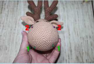 Пришить рога к верхушке головы, сложить уши вдвое и пришить по бокам, пришить нос и глаза. Вышить рот черной нитью. Для подвески связать красной нитью цепочку из возд. п. длиной приб. 15 см. и пришить сверху.