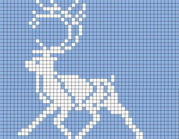 Рисунок связан спицами, пряжей двух красок — белой и синей. Схема вязания рисунка спицами