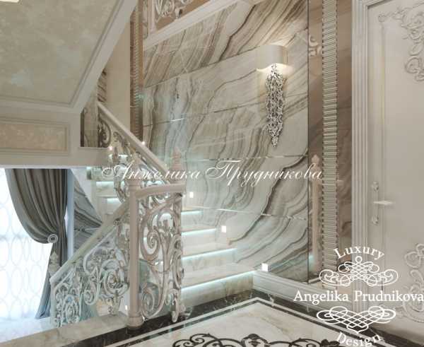 На фото: Дизайн дома в стиле барокко на Новорижском шоссеСвежие белые и голубые оттенки, мраморный пол, украшенный узором из резного камня, арочные двери с роскошным лепным декором, фрески, банкетки с обивкой из синего бархата на гнутых серебристых ножках – барочный дизайн внутри частного дома смотрится очень эффектно. А «изюминкой» такого интерьера может стать современная каскадная люстра.