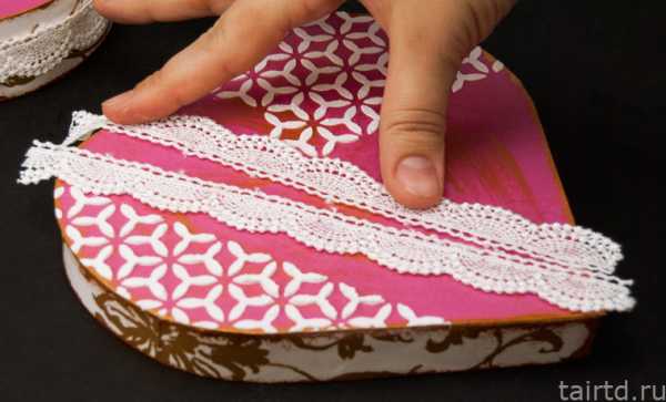 Приклеиваем кружево посередине боковины коробки. Мы специально делали расчеты для крышки чуть больше, чтобы эта кружевная лента не помешала коробке закрываться.