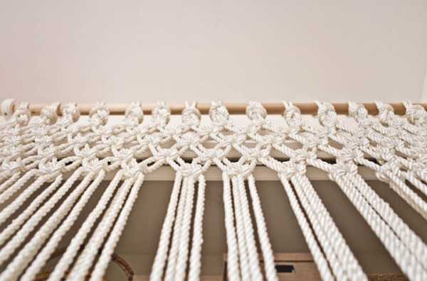 Вот, например, алгоритм создания красивой шторы макраме на окно, которая будет декорирована бусинами. Не обойтись без деревянной планочки, на которой будут крепиться нити. Понадобятся 30 нитей четырехметровых и столько же – восьмиметровых. Разделив пополам восьмиметровые, между ними на планке крепим четырехметровые.