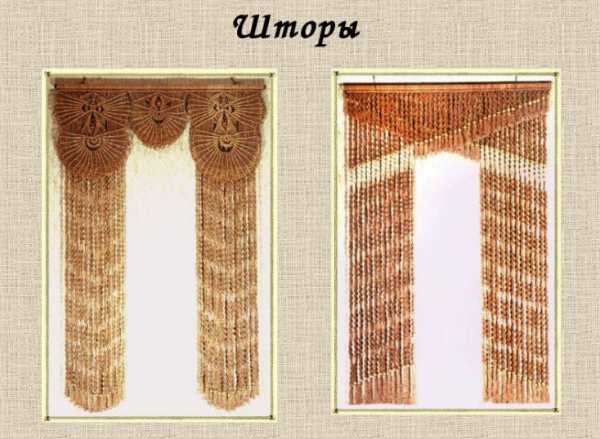 Дверные проемы также можно украсить оригинальными шторами. Они должны состоять не из сплошного полотна, а из отдельно свисающих элементов. Вы можете оформить их в виде обыкновенной бахромы украшенной бусинами или крученых жгутов. Шторы для дверей должны быть достаточно тяжелыми и жесткими, поэтому лучше их вязать из толстого шпагата.