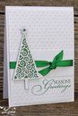 Прострочите края рождественской ёлки, сделанной из плотной бумаги, на швейной машинке. Украсьте ёлку снежинками. Для более простой версии открытки проклейте ёлку дополнительным слоем плотной бумаги, чтобы получить объёмное изображение.