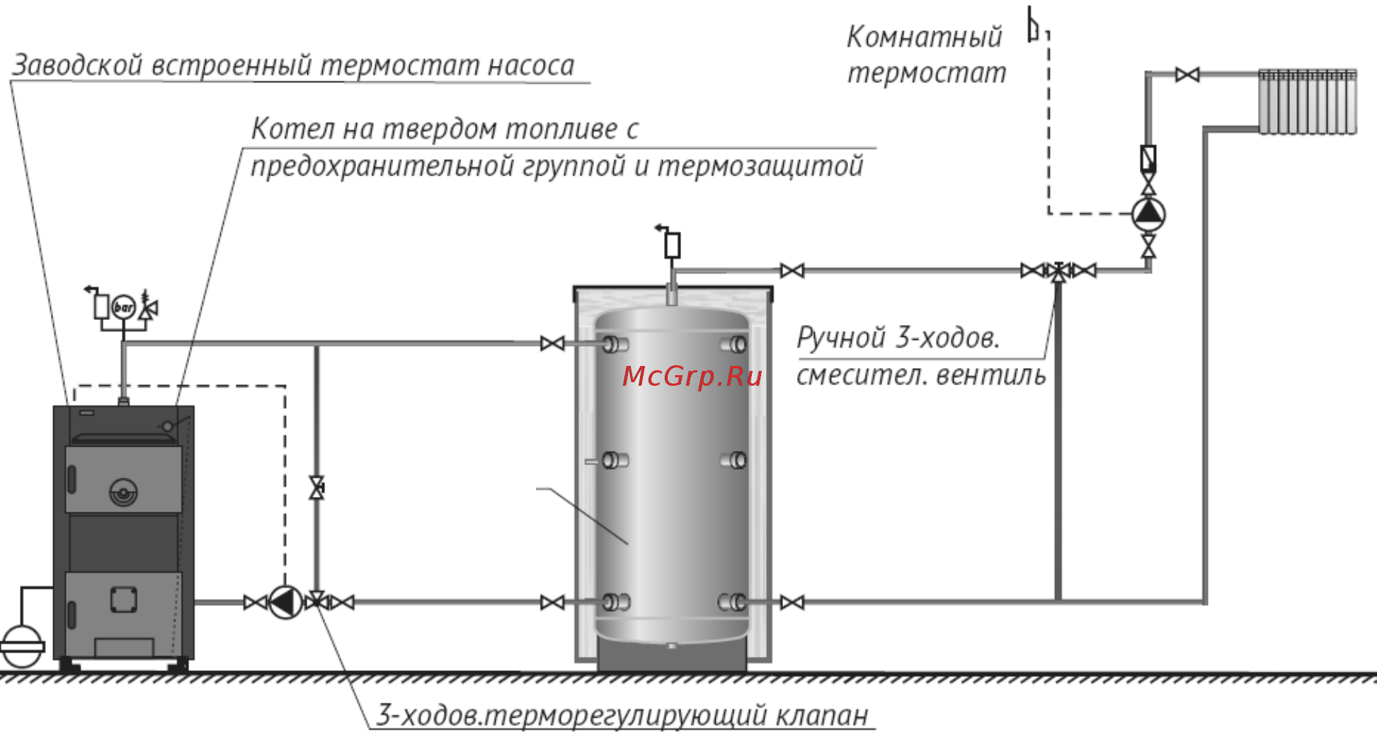 Постоянное и равномерное движение теплоносителя обеспечивается за счет циркуляционного насоса, предусмотренного схемой отопления бойлером.