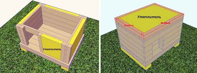 Как правило, для утепления обычно применяют пенопласт, минеральная вата или иной подходящий строительный утеплительный материал. И самое важно, чтобы не переусердствовать при утеплении, потому что он воздухонепроницаемый. Из-за нехватки чистого воздуха, собака не захочет быть в такой конуре, а особенно, если лаз будет завешен. Кроме того, не забывайте о том, что кровля и пол будки тоже должна быть утепленными. Но и тут утеплительный слой не должен быть очень большим. Чтобы в зимний период в конуру не задувал ветер, над лазом стоит прибить плотную ткань, которая будет порезана на широкие полоски.