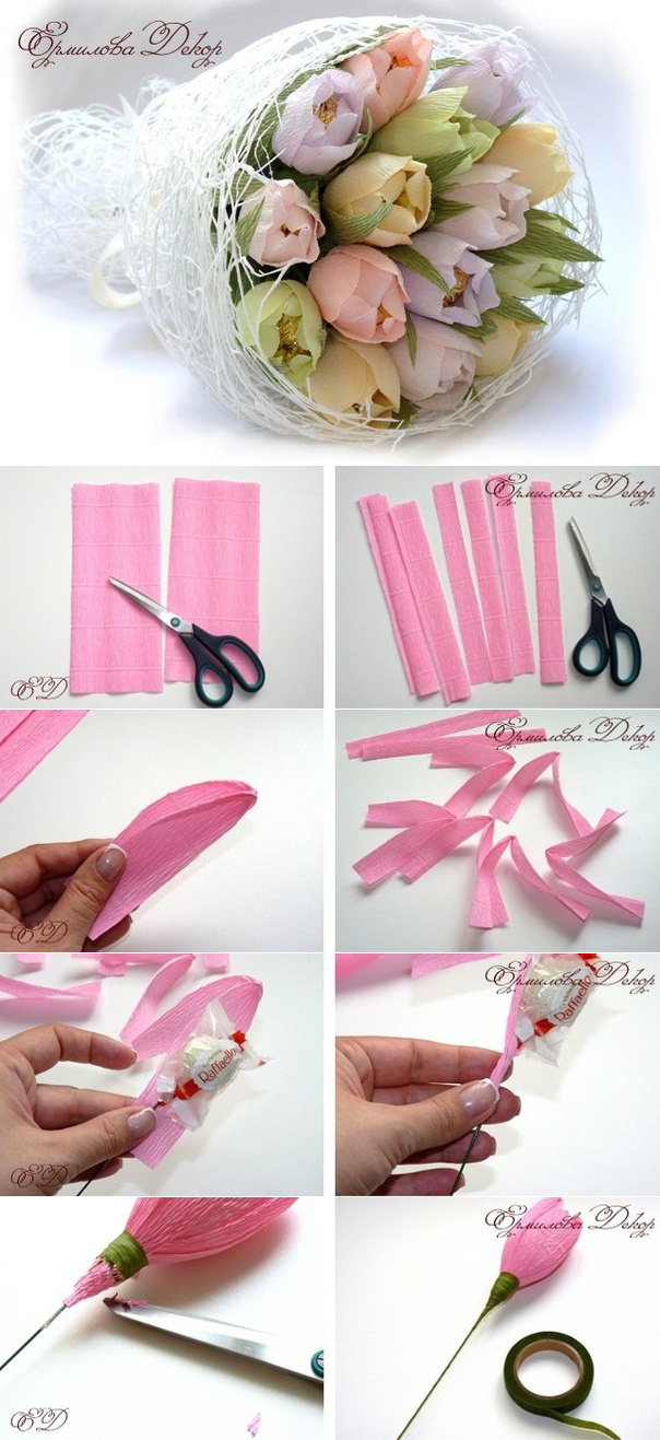 Из тюльпанов получаются букеты из конфет для начинающих, пошаговое фото вам покажут, насколько просто сделать из бумаги эти весенние цветы и как красиво они сокроют в своей сердцевинке вкусную шоколадную конфету, которая обязательно должна быть круглой формы.