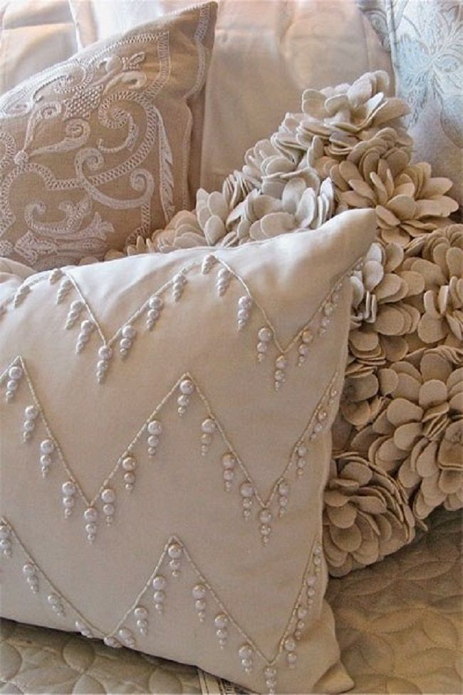 Идеи для декорирования подушек могут быть разнообразные. От кружевных цветов до тонких растительных рисунков.