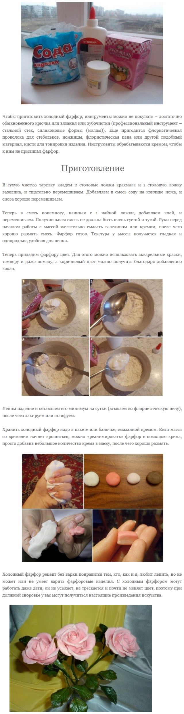 Есть несколько способов приготовления – с варкой, без варки и в микроволновке. Такой фарфор хранится в плотной упаковке, с минимальным проникновением воздуха, от 3 недель до шести месяцев. Это очень приблизительный рецепт, который каждая рукодельница старается самостоятельно усовершенствовать. Если вам понравится работа с холодным фарфором, то постарайтесь в дальнейшем приготовить его самостоятельно – это увлекательный процесс, который сэкономит ваши деньги. К тому же поэкспериментировав, вы можете придумать свой рецепт идеального холодного фарфора.