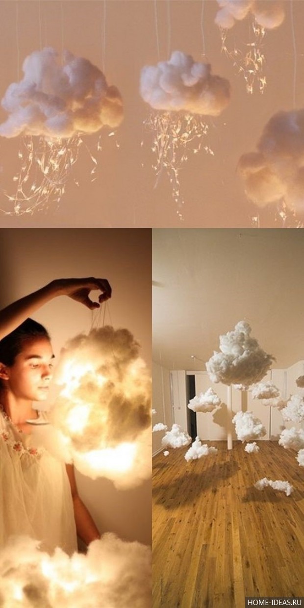 Добавьте волшебства в свою спальню с помощью ватных облаков и гирлянд.
