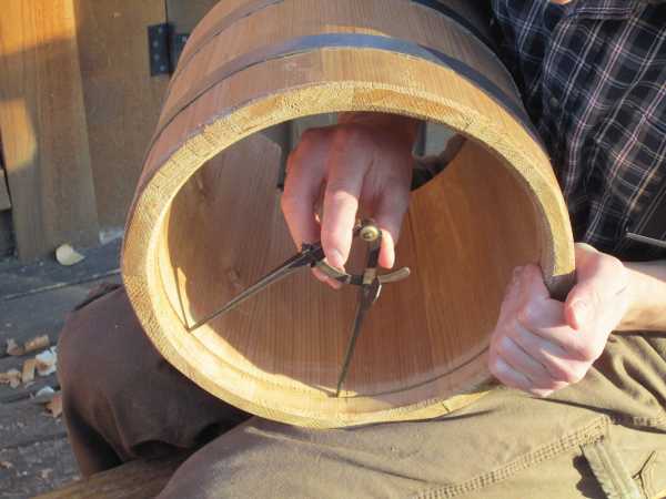Слегка постукивая молотком по обручу, осаживаем его и проверяем, плотно ли сошлись краями клёпки. Чтобы добиться контакта клёпок по всей боковой поверхности, нужно добавить клёпку или вытащить лишнюю и уже после этого ставить постоянный обруч. Кстати, если изменение количества клёпок не даёт желаемого эффекта, нужно просто сузить одну из клёпок или же заменить узкую на более широкую.