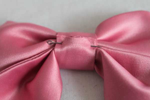 Перемычка обматывается плотным кольцом вокруг основной части банта, лишнее срезается. Затем эта часть банта сшивается мелкими стежками чуть ниже центра, дабы не заметен был шов.