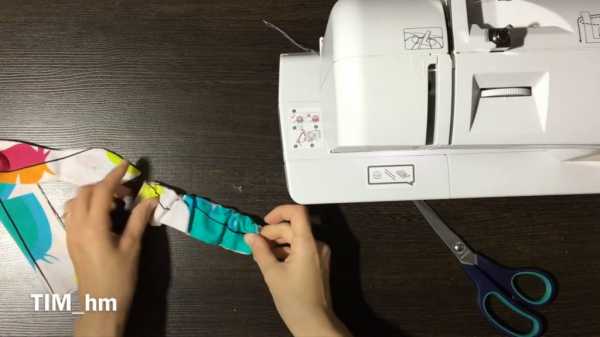 Две получившиеся полоски необходимо сшить вместе, сложив друг к другу лицевыми сторонами. Вам может понадобится и оверлок, чтобы обработать края, но можно просто аккуратно опалить края ткань зажигалкой, а затем прострочить зигзагом. Когда будете сшивать два прямоугольника, оставьте незашитым один край с узкой стороны, чтобы вывернуть заготовку, иначе красота нашего изделия будет испорчена торчащими нитками.
