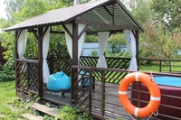 Такой объект должен располагаться на дальнем участке и прятаться от посторонних глаз. Расположите постройку рядом с бассейном, чтобы отдых был максимально продуктивным. Стены беседки должны быть открытыми, вокруг должен быть рассыпан песок или речная галька. С помощью такой вариации вы сможете создать мини-пляж на своем дачном участке.