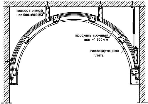 К потолочным профилям изогнутую деталь крепим двумя направляющими соответствующей длины.